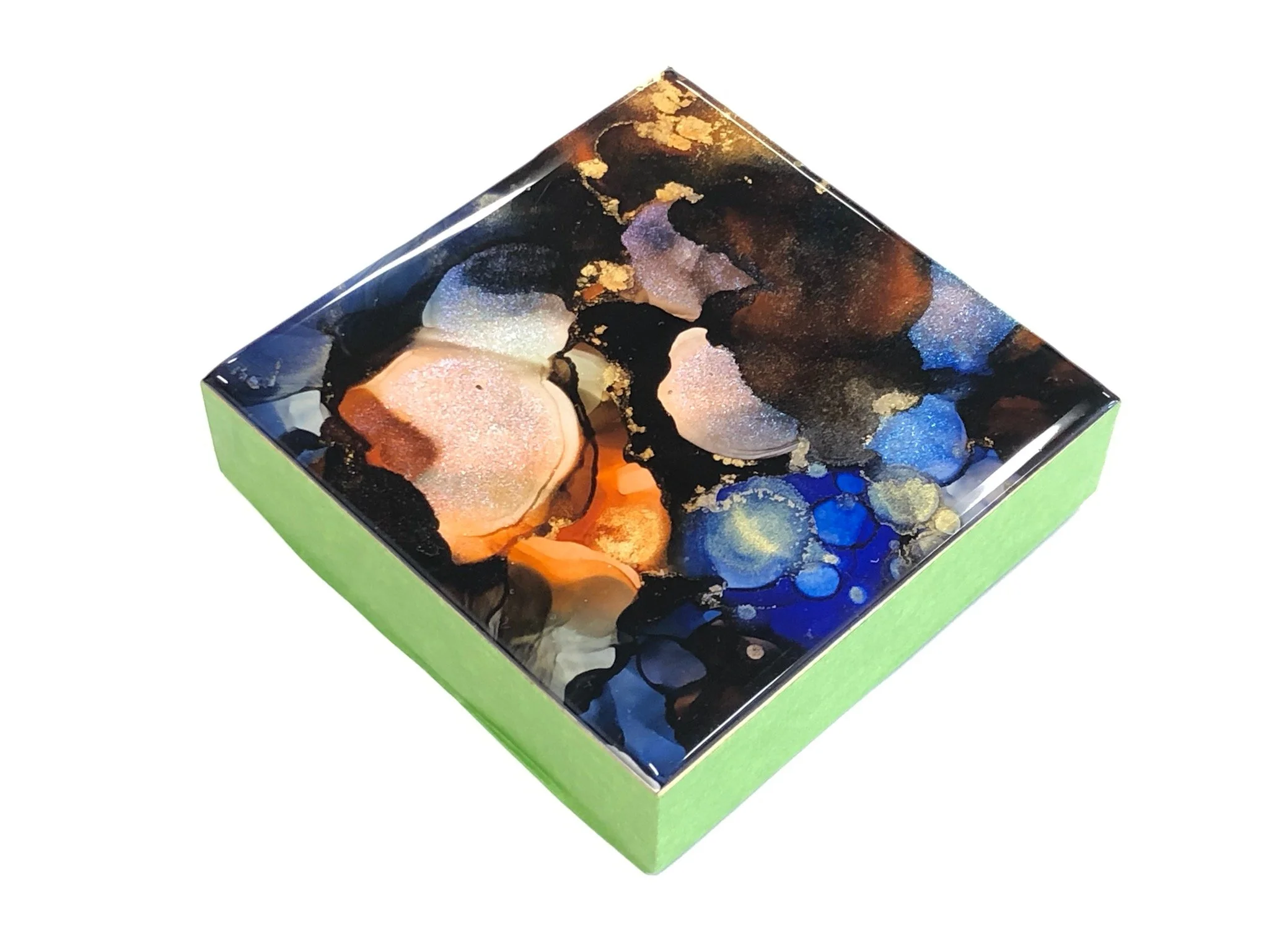 Each student will make different kinds of coasters, including alcohol ink coasters and resin mold coasters, and will leave being able to use resin safely on their own.